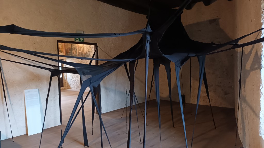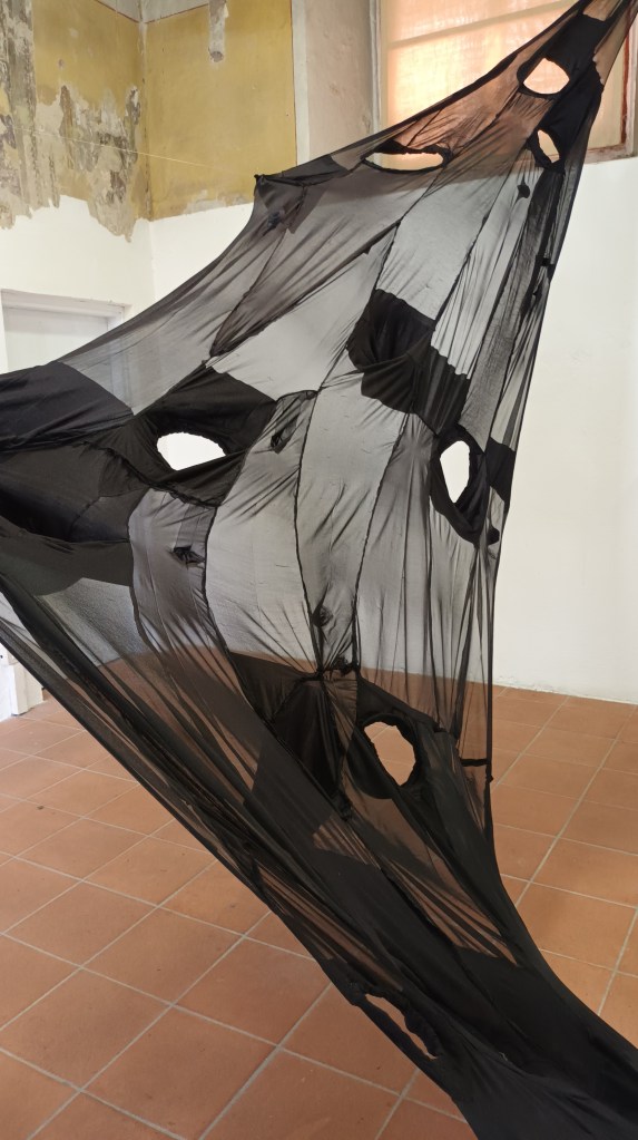 In my installations the work is material, realized with pieces of tights left whole, combined as to create a game of transparencies in the space. The effect is obtained by combining tights of different thickness, in order to better play with the shadows that such elegant and smooth material is able to create.
