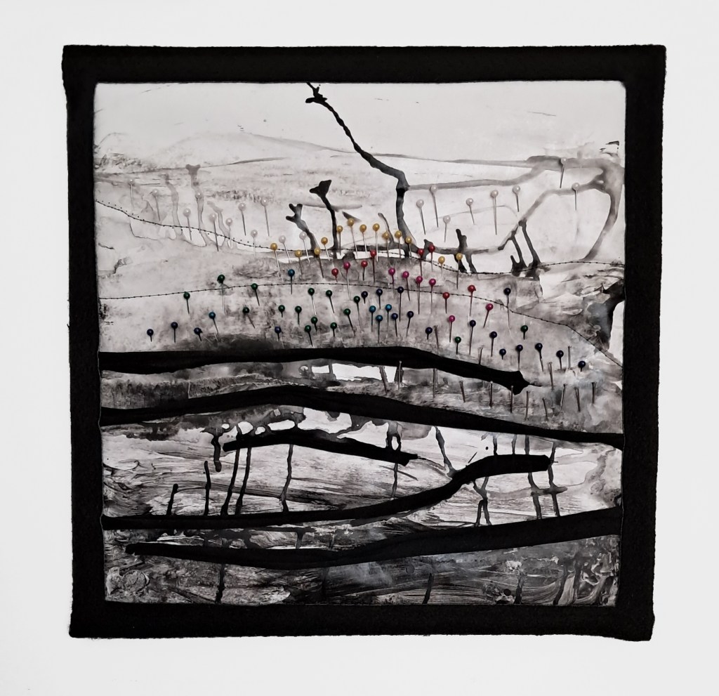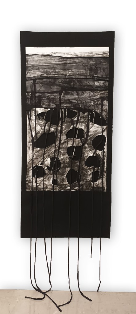 Giulia Nelli ha deciso di utilizzare il collant. L’artista ha iniziato strappando questo tessuto fino a isolare l’elemento essenziale, il filo, per poi rielaborare nuovi orditi e trame fermate su supporti rigidi. Ha poi inserito altri elementi come l’inchiostro o penna nera, materiali come la plastica, il vetro, il filo di ferro, per creare movimenti e nuovi legami con lo spazio interno all’opera ma anche esterno ad essa. Il filo diviene così il nucleo primario, il protagonista dell’opera che si manifesta attraverso l’abile gesto dell’artista in intrecci, nodi e snodi che si diramano, prendendo direzioni differenti, in un gioco elegante e raffinato, alla ricerca di un’armonia estetizzante, come nel caso dell’opera L’evoluzione di un sogno. Giulia Nelli lavora disgregando la materia per poi ri-generarla, scompone e annulla la forma del collant per riassemblare forme astratte e organiche che ricordano le sottili trame naturali delle ragnatele. In Oblio e La vita nascosta si percepisce invece una presenza materica carica di reminiscenze informali. (Tratto dal testo “Suggestioni simboliche e forme visionarie” della Curatrice Mariacristina Maccarinelli)