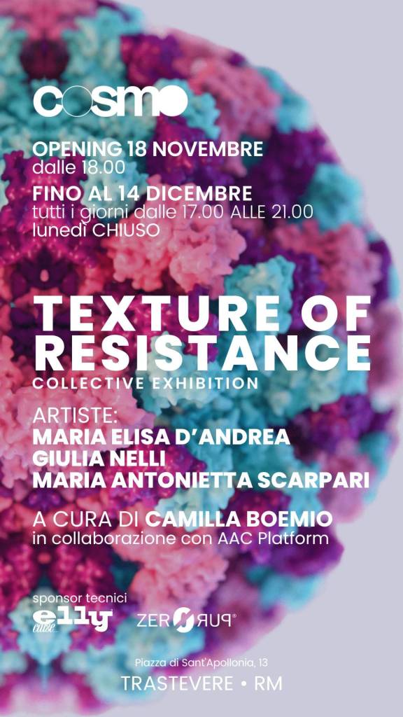 TEXTURE OF RESISTANCE Spazio COSMO – Roma, Piazza di Sant’Apollonia, 13 a cura di Camilla Boemio, in collaborazione con AAC Platform Sponsor tecnici Elly Calze, Orsogna Winery Inaugurazione venerdì 18 novembre, ore 18